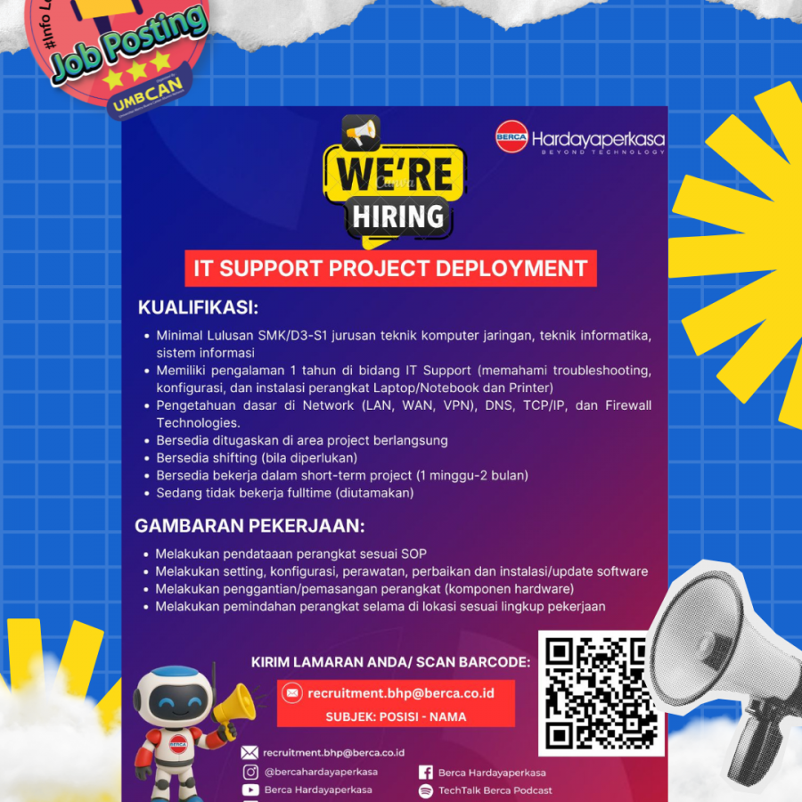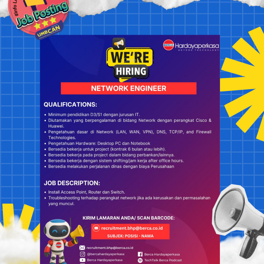 Segera siapkan CV terbaik kamu, serta kelengkapan melamar lainnya ke recruitment[email protected] dan juga cc ke email [email protected]