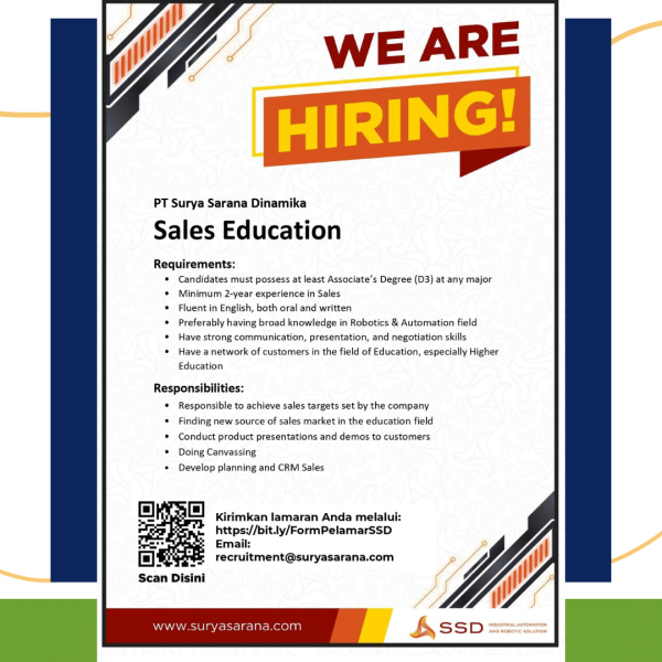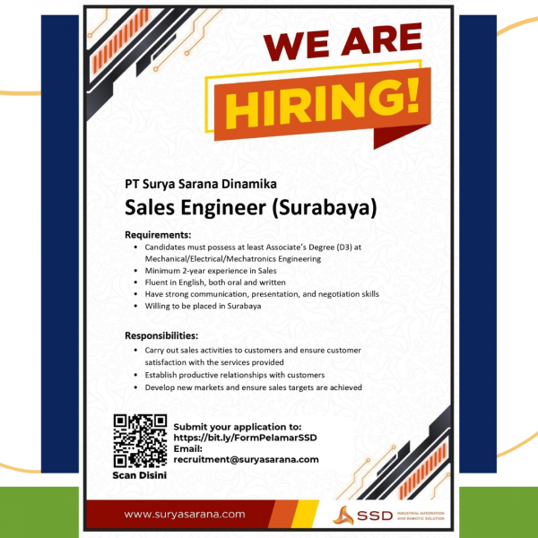 Sales Engineer, Sales Education Cikarang, Surabaya Oktober 11, 2023 D3 Full-time PT Surya Sarana Dinamika Description